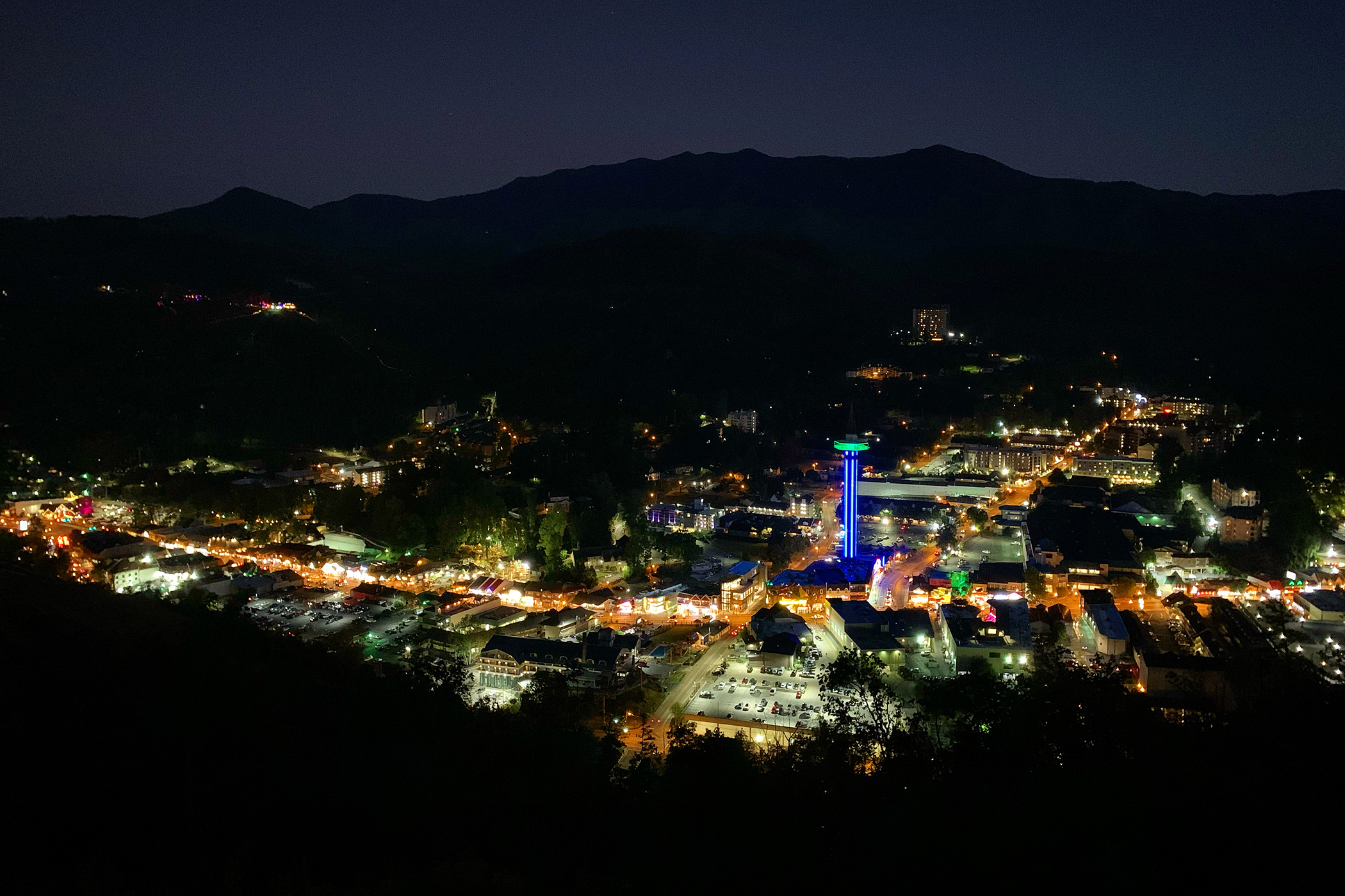 Lights of Gatlinburg below, nightfall on LeConte above. #shotoniPhone from the Gatlinburg SkyBridge.