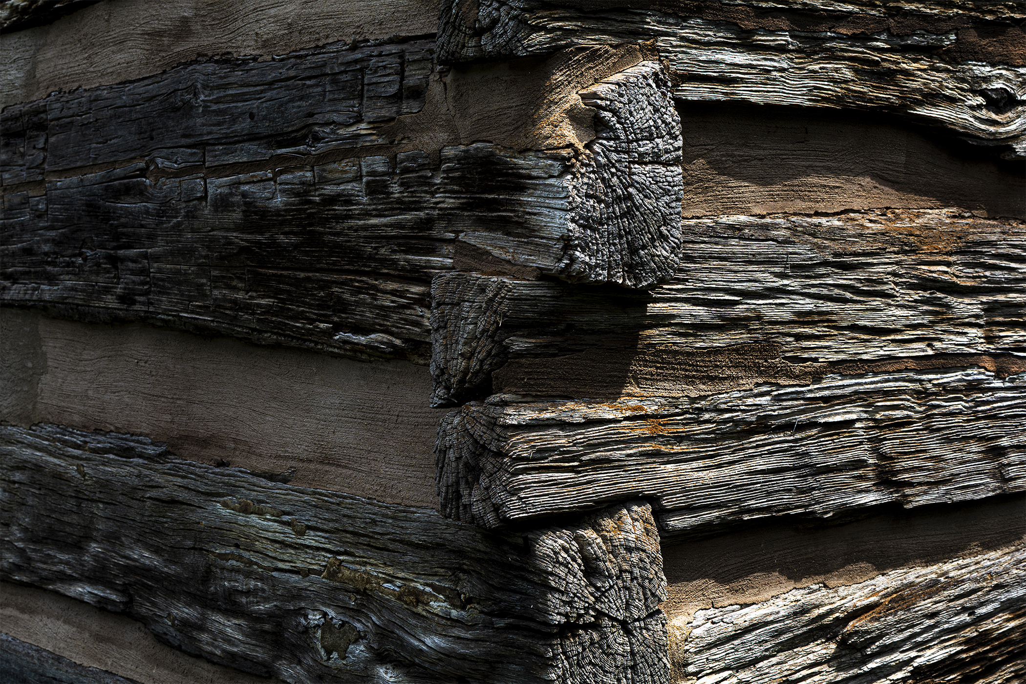 The corner of a log cabin at Indiana’s Spring Mill State Park.